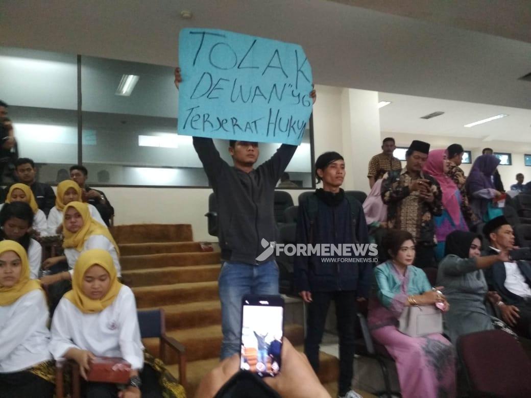 Mereka menutut dibatalkannya pelantikan salah satu anggota dewan dari Partai Golkar berinsial (Mr) yang tersandung kasus penistaan agama namun hingga saat ini belum dieksekusi. “Interupsi pimpinan sidang, batalkan dewan yang terjerat kasus hukum,” ungkapnya berulang-ulang.