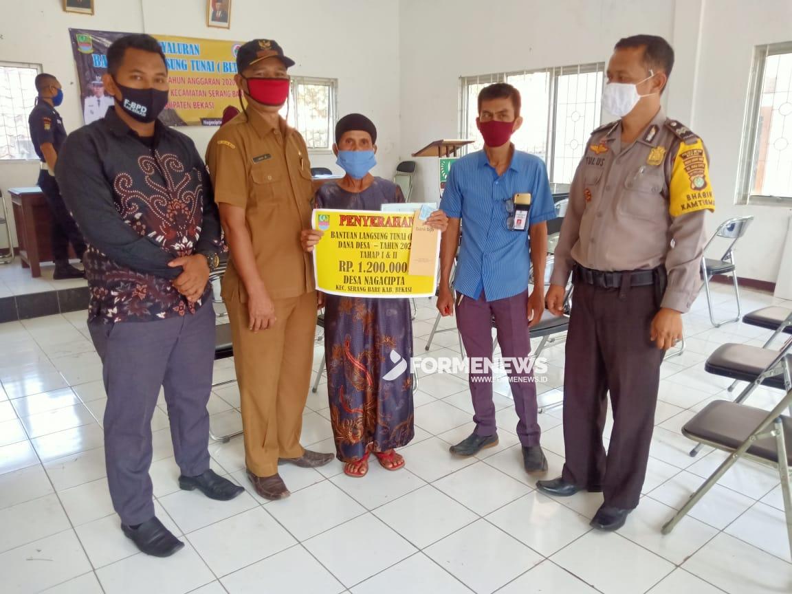 SERANG BARU – Sebanyak 249 KK, warga Desa Nagacipta, Kecamatan Serang Baru, Kabupaten Bekasi menerima Bantuan Langsung Tunai (BLT) Dana Desa tahap satu Tahun Anggaran 2020. BLT tersebut diberikan langsung oleh pihak Bank BJB yang disaksikan langsung Pemdes Nagacipta, BPD, PLD, Bimaspol dan Babinsa. Pemberian BLT dicairkan dua bulan, April-Mei sebesar Rp. 1.200.000,- yang dilaksanakan di Aula Desa Nagacipta, Selasa (16/6/2020).