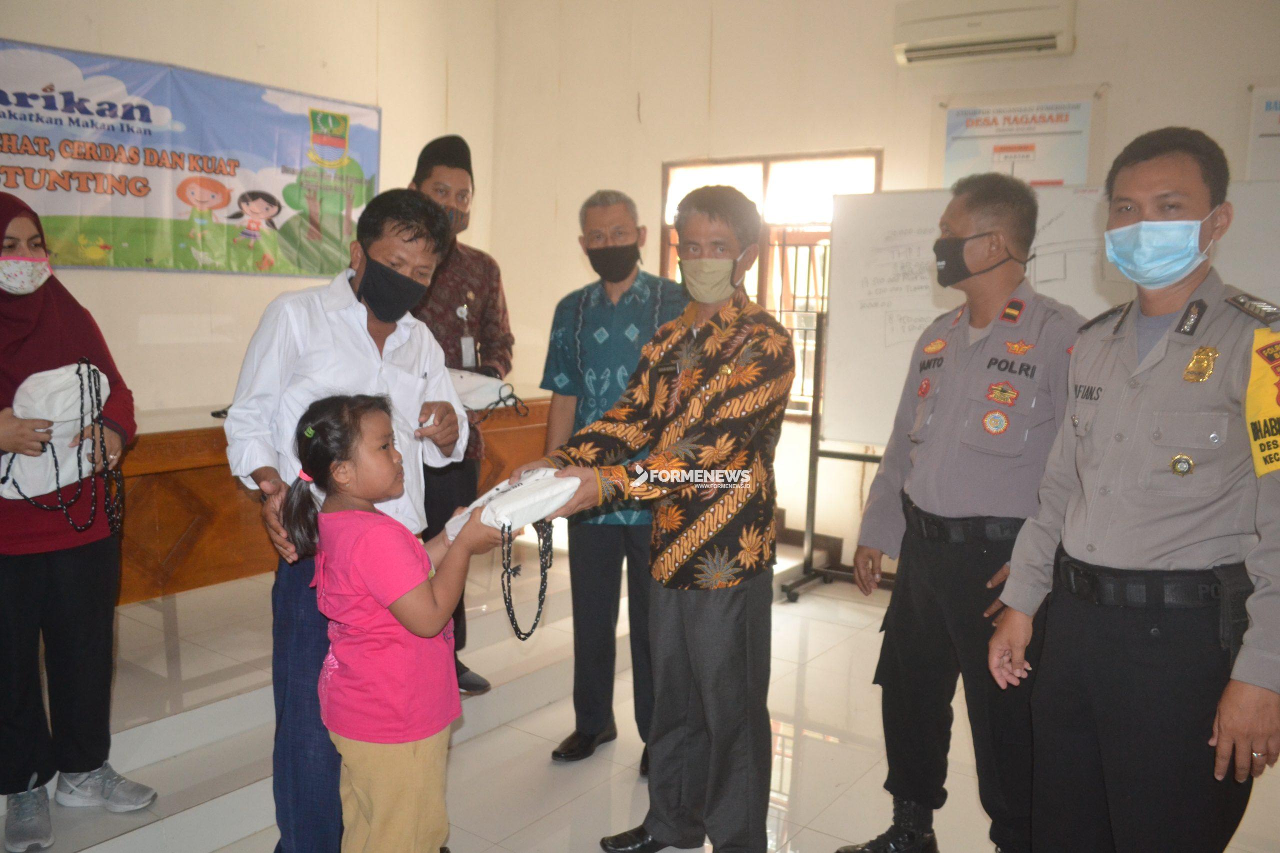 SERANG BARU – Sekitar 220 anak Sekolah Dasar Negeri Desa Nagasari, Kecamatan Serang Baru, Kabupaten Bekasi diberikan makanan yang bahannya dari Ikan, tempat air dan buku dalam rangka program gerakan masyarakat makan ikan (GemarIkan). Kegiatan tersebut dilaksanakan di Aula Desa Nagasari, Kamis (23/7/2020). GemarIkan ini agar anak-anak menjadi Generasi Sehat, Cerdas dan Kuat, dan bebas Stunting. Pada kesempatan tersebut hadir, Pemdes, BPD, DPK, Bappeda, Pendamping PKH, PSM, Bhabinkamtibmas dan Babinsa.