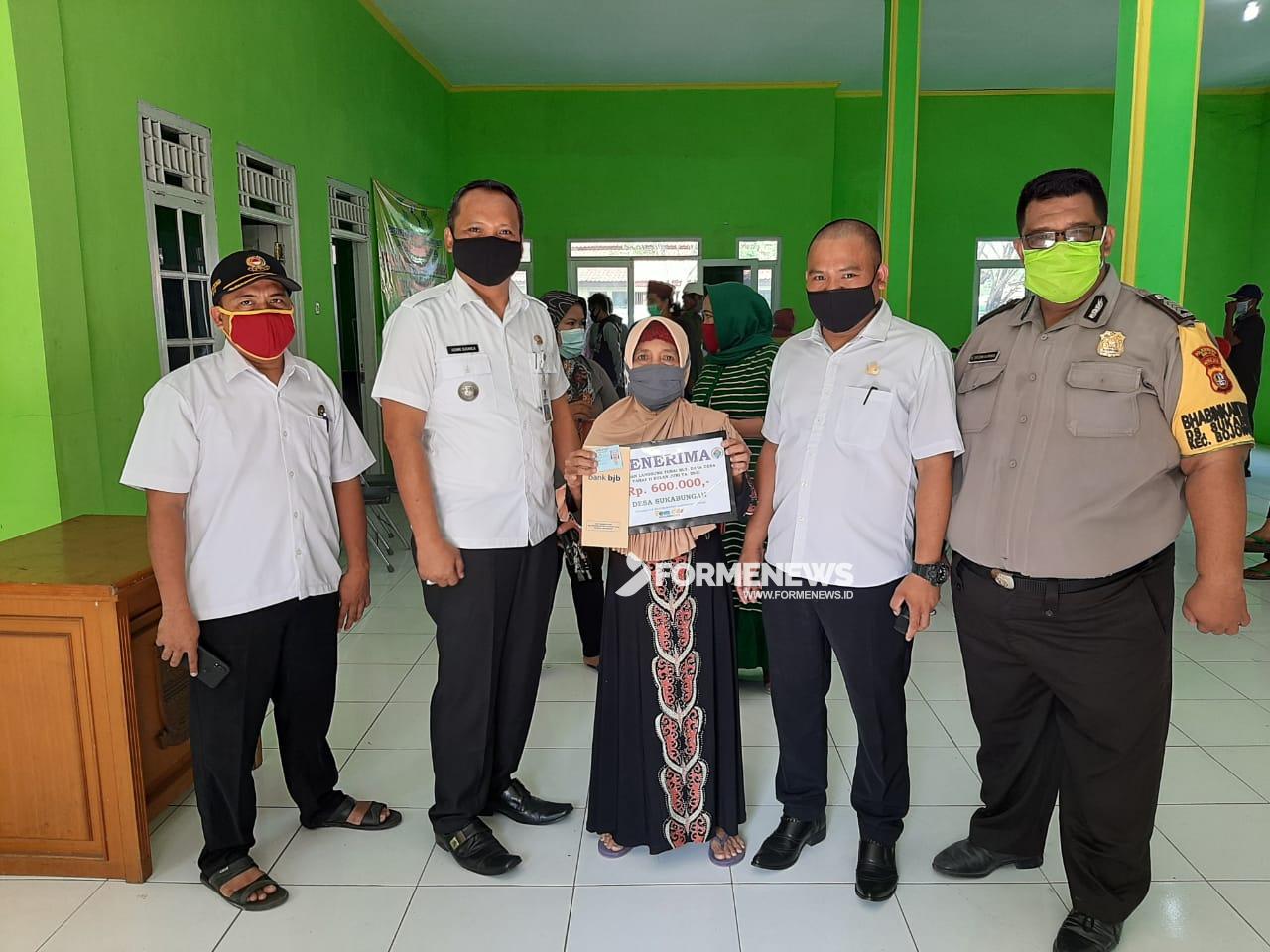 BOJONGMANGU – Sekitar 238 warga Desa Sukabungah, Kecamatan Bojongmangu, Kabupaten Bekasi menerima Bantuan Langsung Tunai Dana Desa (BLT-DD) Tahun 2020. BLT yang dibagikan terhadap warga diberikan langsung oleh pihak Bank BJB, yang disaksikan Pemdes Sukabungah, kecamatan, BPD, Pendamping Lokal Desa (PLD), Babinsa dan Bimaspol. Pemberian BLT tersebut dilaksanakan di Aula Desa Sukabungah, Rabu (8/7/2020).