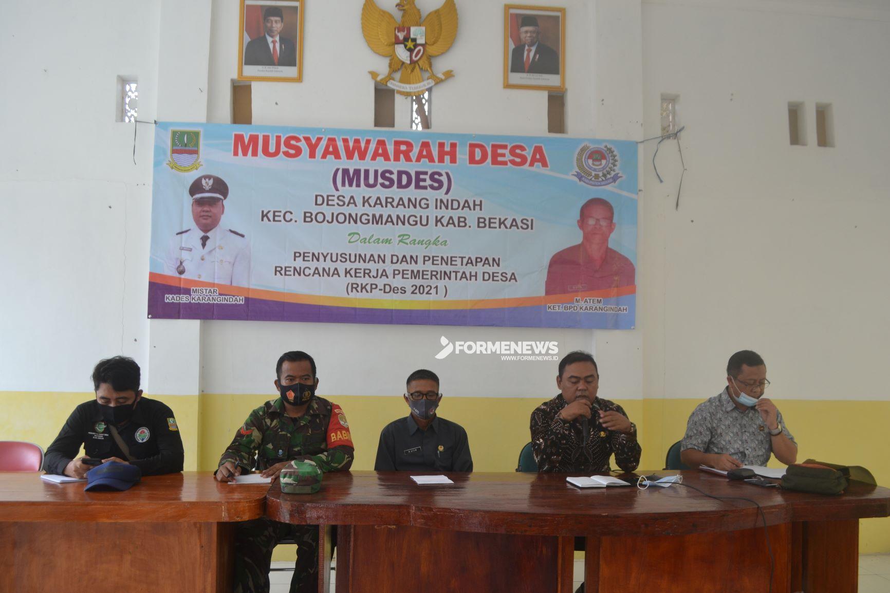 BOJONGMANGU – Musyawarah Desa (Musdes) Desa Karang Indah, Kecamatan Bojongmangu fokus pada pemulihkan ekonomi masyarakat yang sempet terpuruk akibat Covid-19. Hal itu disampaikan Kade Karang Indah, Kepala Desa Karang Indah Mistar pada acara penyusunan dan penetapkan Rencana Kerja Pemerintah Desa (RKPDes) Tahun 2021 di Aula Desa Karang Indah, Sabtu (7/11/2020).