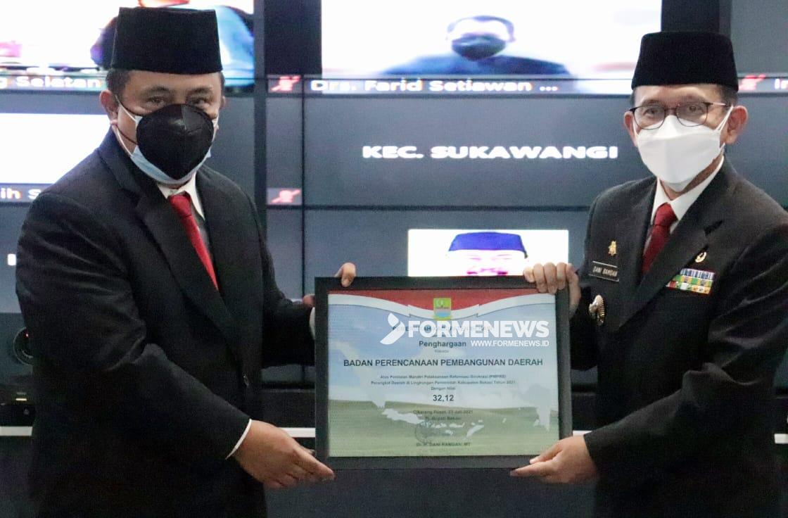 CIKARANG PUSAT – Badan Perencanaan dan Pembangunan Daerah (Bappeda) Kabupaten Bekasi meraih penghargaan Reformasi birokrasi terbaik tingkat Kabupaten Bekasi untuk tata kelola pemerintahan. Penghargaan tersebut diberikan Pj Bupati Bekasi Dani Ramdan kepada Kepala Bappeda H. Dedi Supriyadi saat saat penyampaian hasil Penilaian Mandiri Penyelenggaraan Reformasi Birokrasi (PMPPRB) di Command Center, Gedung Diskominfosantik, Jum’at (30/07/21).