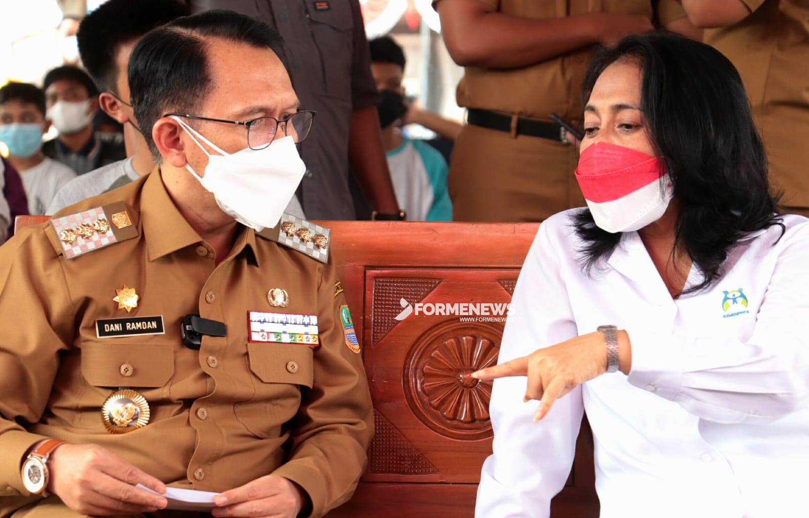BABELAN – Pj Bupati Bekasi Dani Ramdan mendampingi Menteri Pemberdayaan Perempuan dan Perlindungan Anak (PPPA) Bintang Puspayoga dalam kegiatan vaksinasi Covid-19 untuk anak.