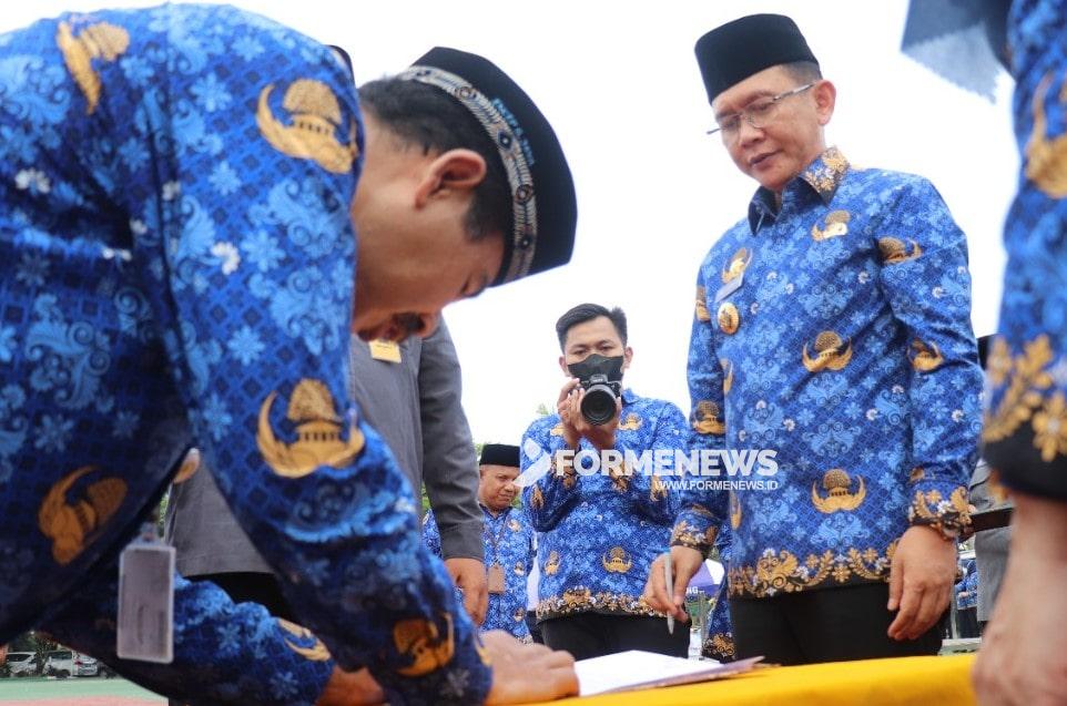 CIKARANG PUSAT – Aparatur Sipil Negara (ASN) Kabupaten Bekasi menandatangani Surat Kesepakatan Netralitas ASN menjelang Pilkada serentak 2024 pada apel pagi Korps Pegawai Republik Indonesia (KORPRI) di lingkungan Pemkab Bekasi, di Plaza Pemda, Cikarang Pusat, pada Senin (17/10).