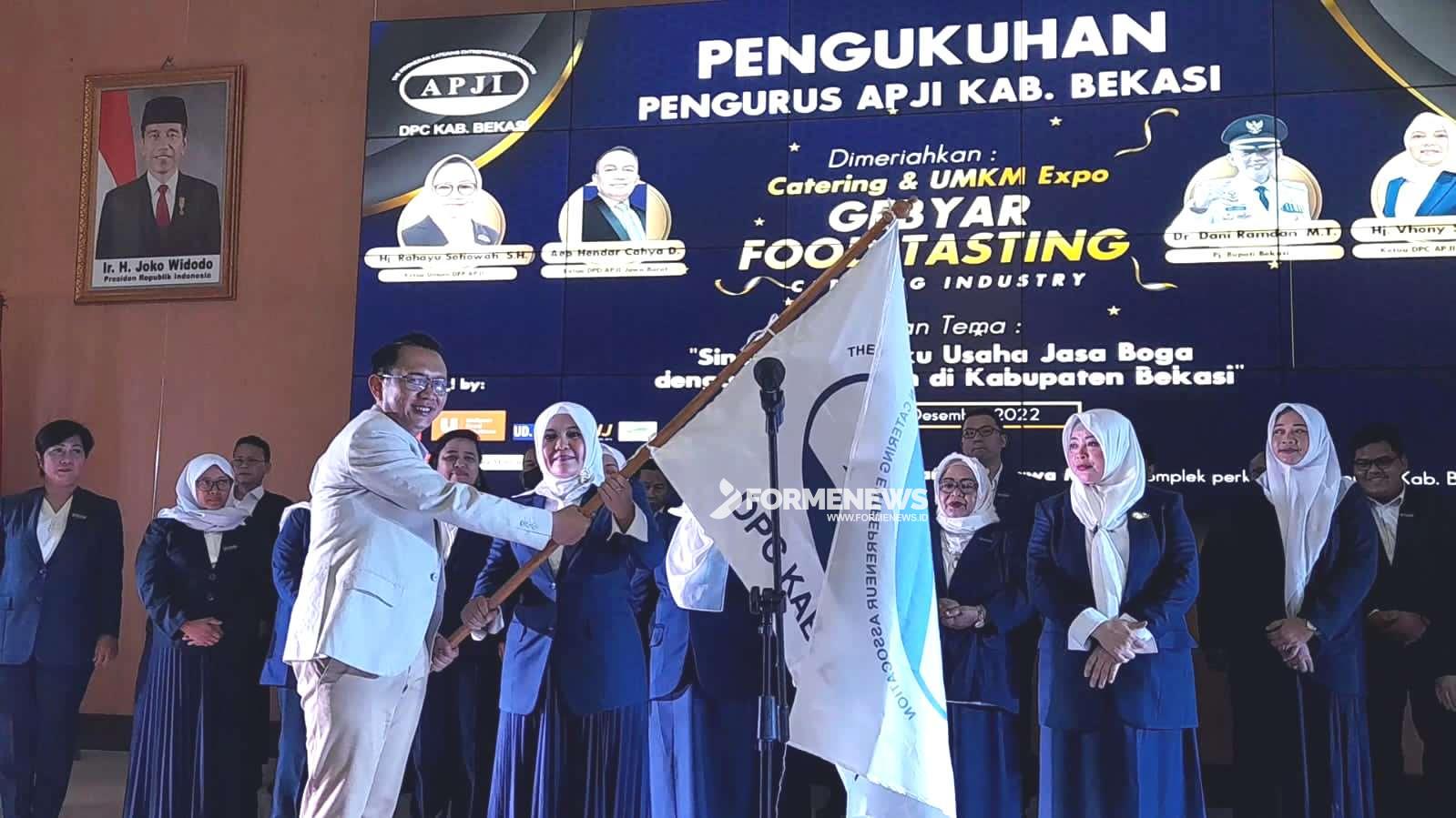 CIKARANG PUSAT – Pj Bupati Bekasi Dani Ramdan didampingi Pj Ketua Tim Penggerak PKK Ria Sabaria Dani Ramdan, menghadiri pengukuhan pengurus Asosiasi Pengusaha Jasa Boga Indonesia (APJI) Kabupaten Bekasi 2022 – 2027, di Gedung Swatantra Wibawa Mukti, Komplek Pemkab Bekasi, Cikarang Pusat, pada Kamis, (01/12/2022).