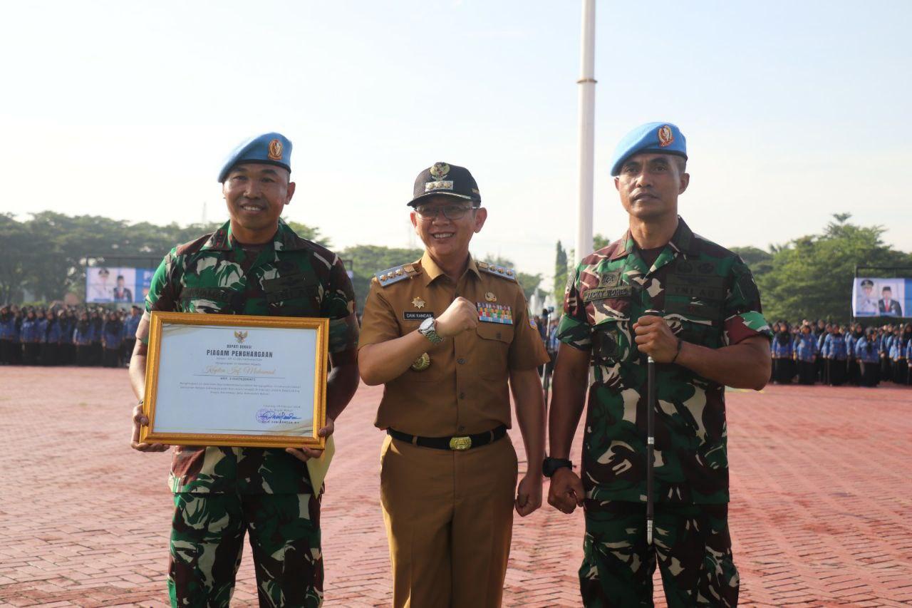 CIKARANG PUSAT – Pemerintah Kabupaten Bekasi memberikan penghargaan khusus kepada prajurit TNI, Kapten (Inf) Muhamad yang berhasil menggagalkan aksi kejahatan jalanan atau pembegalan motor (curanmor) di dekat kediamannya, Desa Lubang Buaya, Kecamatan Setu.
