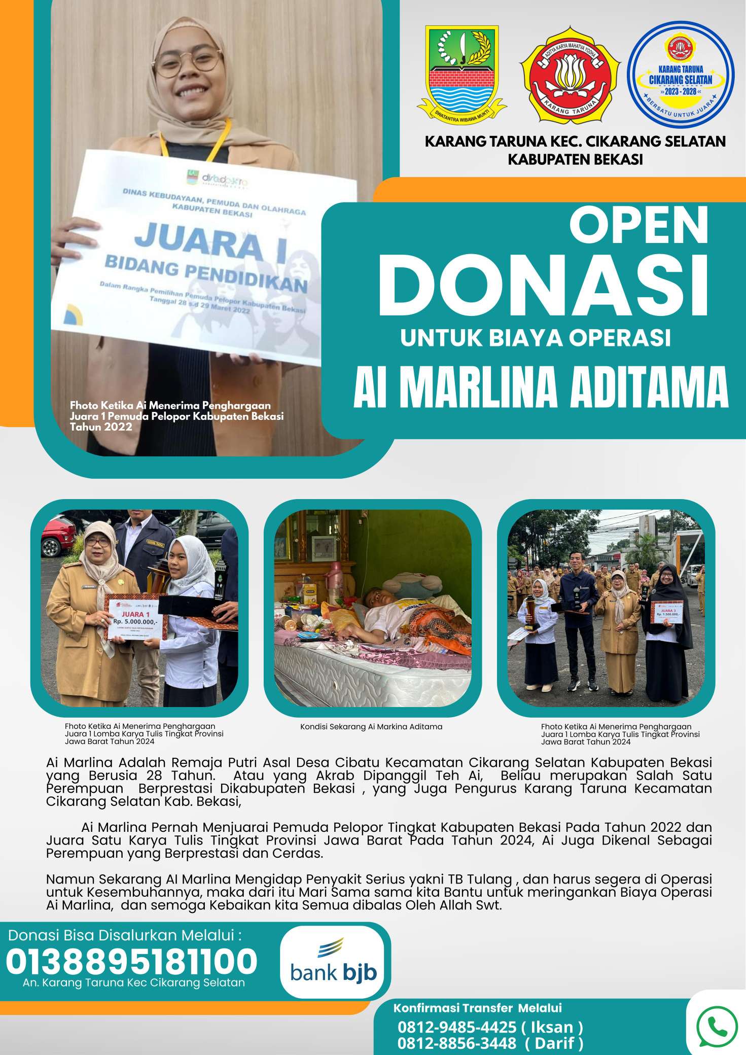 Karena keterbatasan ekonomi, Karang Taruna Kecamatan Cikarang Selatan membuka donasi untuk membantu biaya pengobatan Ai. Bantuan dapat disalurkan melalui rekening Bank BJB nomor 0138895181100 atas nama Karang Taruna Kecamatan Cikarang Selatan.