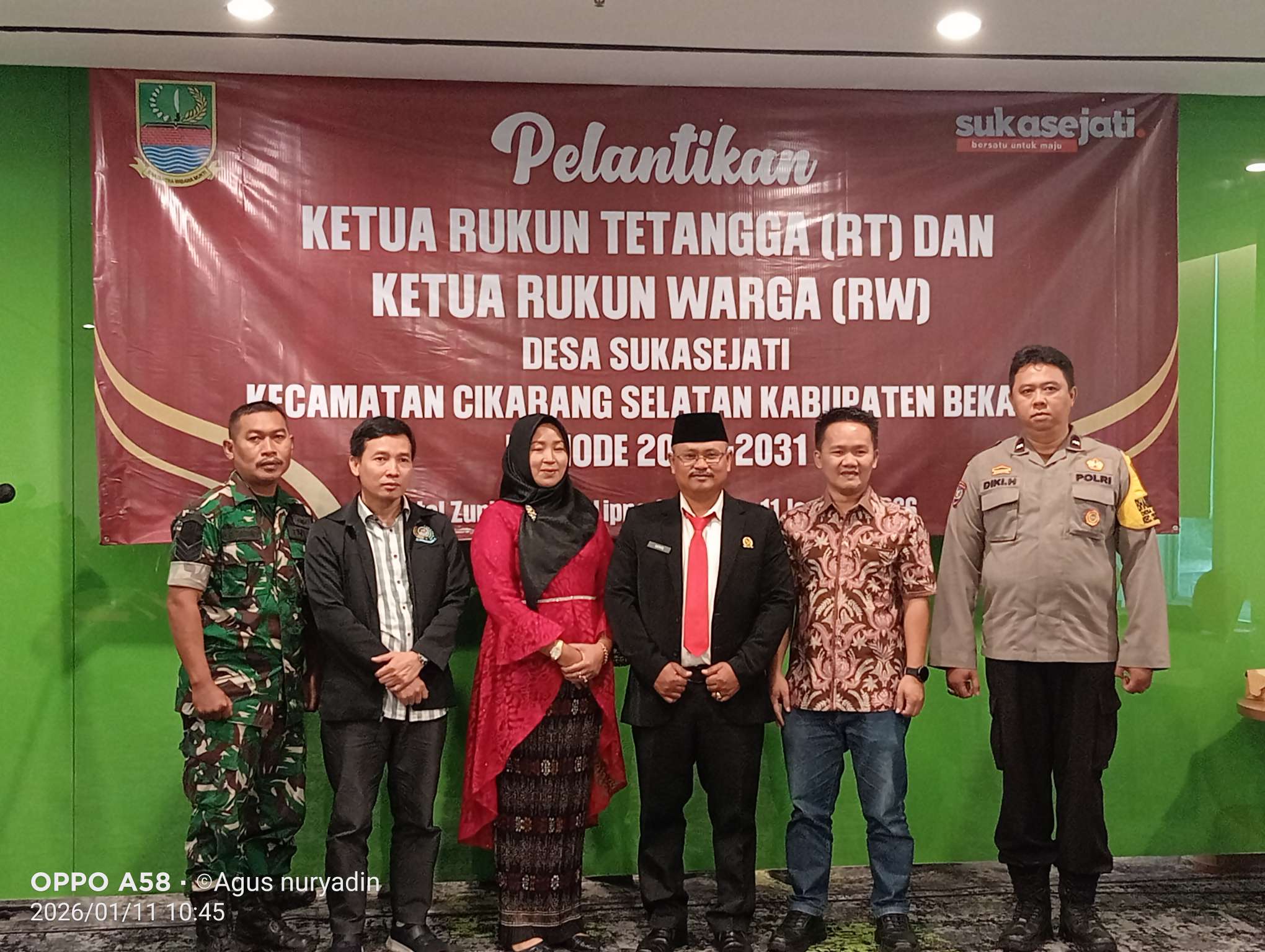 BEKASI, Tarumanegaranews.id – Kepala Desa Sukasejati, Engkos Koswara, melantik 19 Ketua RT dan 1 Ketua RW untuk masa bakti 2026–2031. Pelantikan tersebut digelar di Hotel Zuri Express Lippo Cikarang, Kecamatan Cikarang Selatan, pada Minggu (11/1/2026).