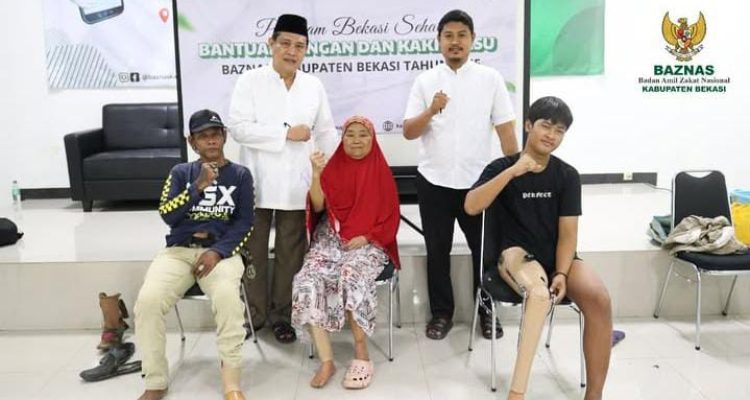 MANAH/AGUS/TARUMANEGARANEWS.ID Foto : Ketua Baznas Kabupaten Bekasi saat memberikan bantuan Kaki dan Tangan Palsu Kepada para Mustahik.